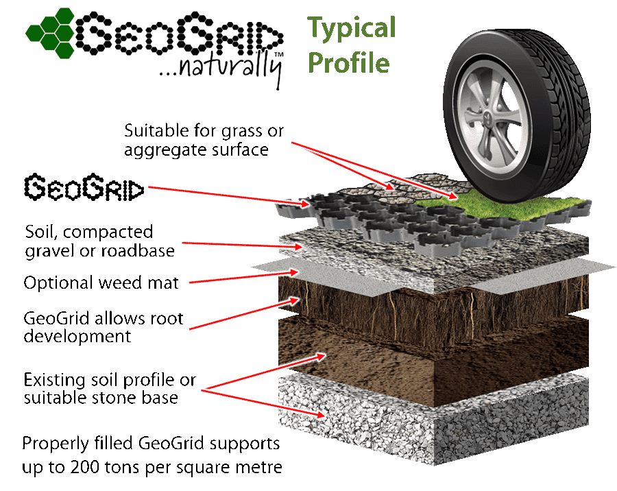GeoGrid offers an attractive alternative to concrete and asphalt pavements and concrete grass stabilization products, and is very easy for the home handyman to install. The plastic panels simply clip together and are laid just under the surface. With the correct sub-base, GeoGrid pavers can easily take the weight of trucks.
